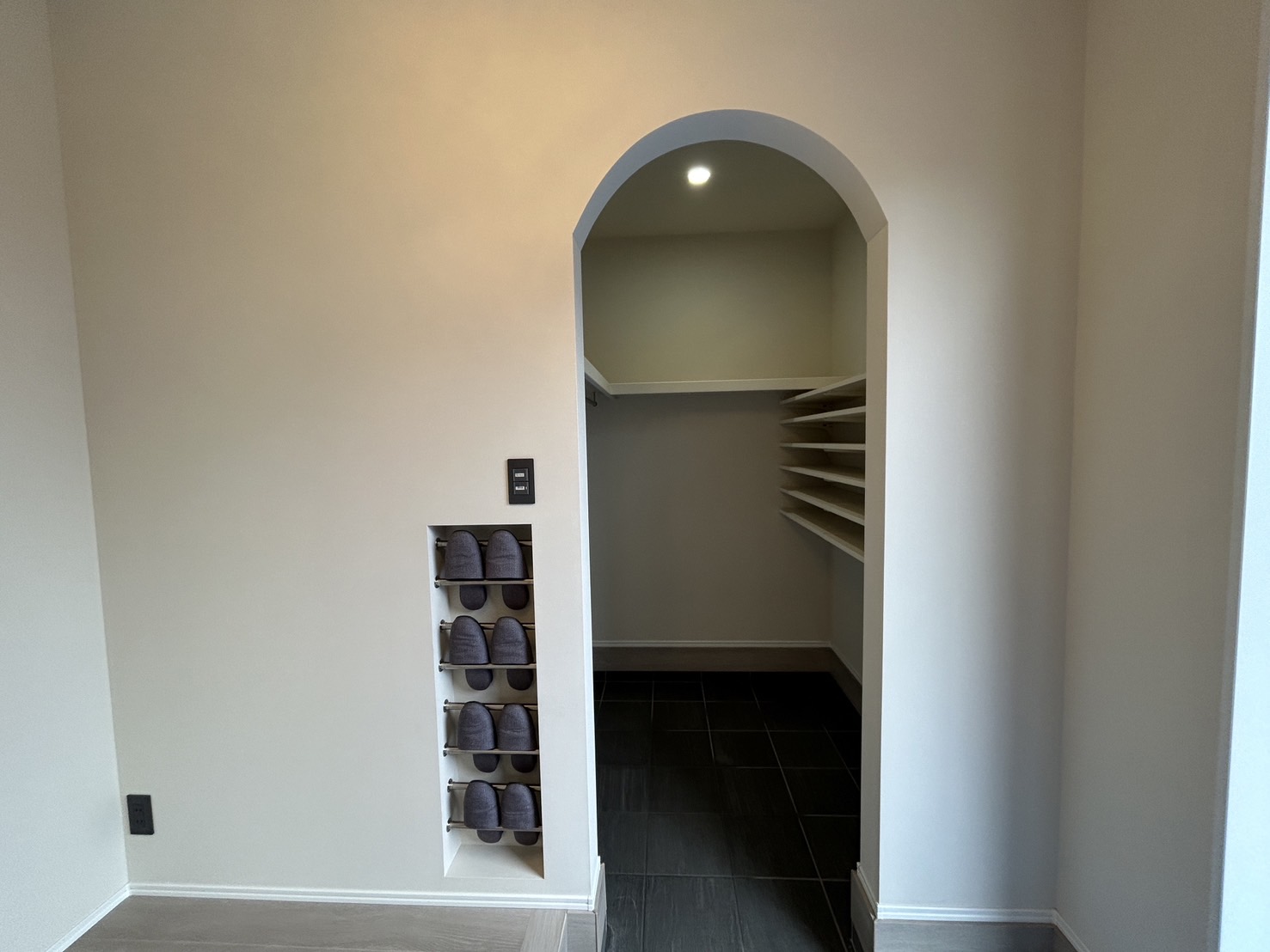 T様ご希望のスリッパ入れは、壁をくり抜くことですっきりと収まり便利ですね👌