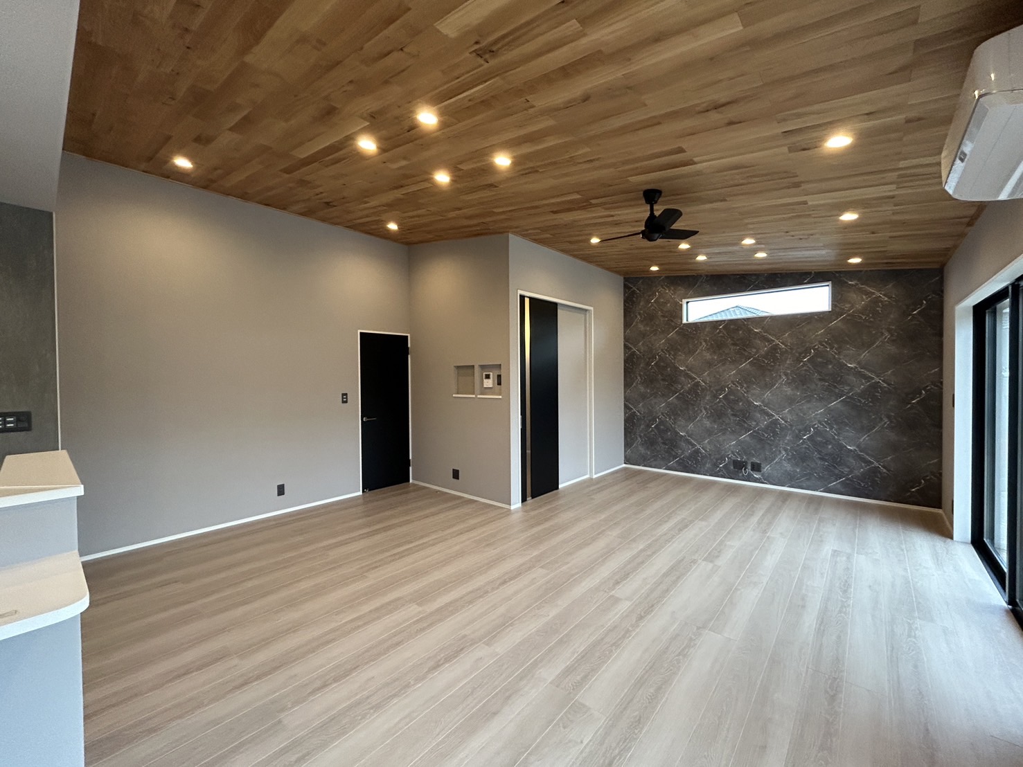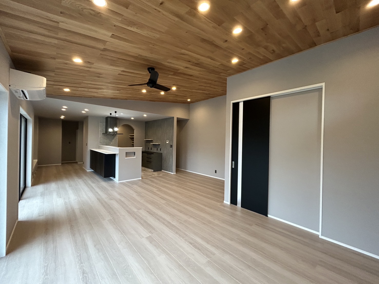 アクセントとしてクロスを変えた壁と木目の羽目板を設置した勾配の天井が印象的です😊空気の循環用にシーリングファンも設置。