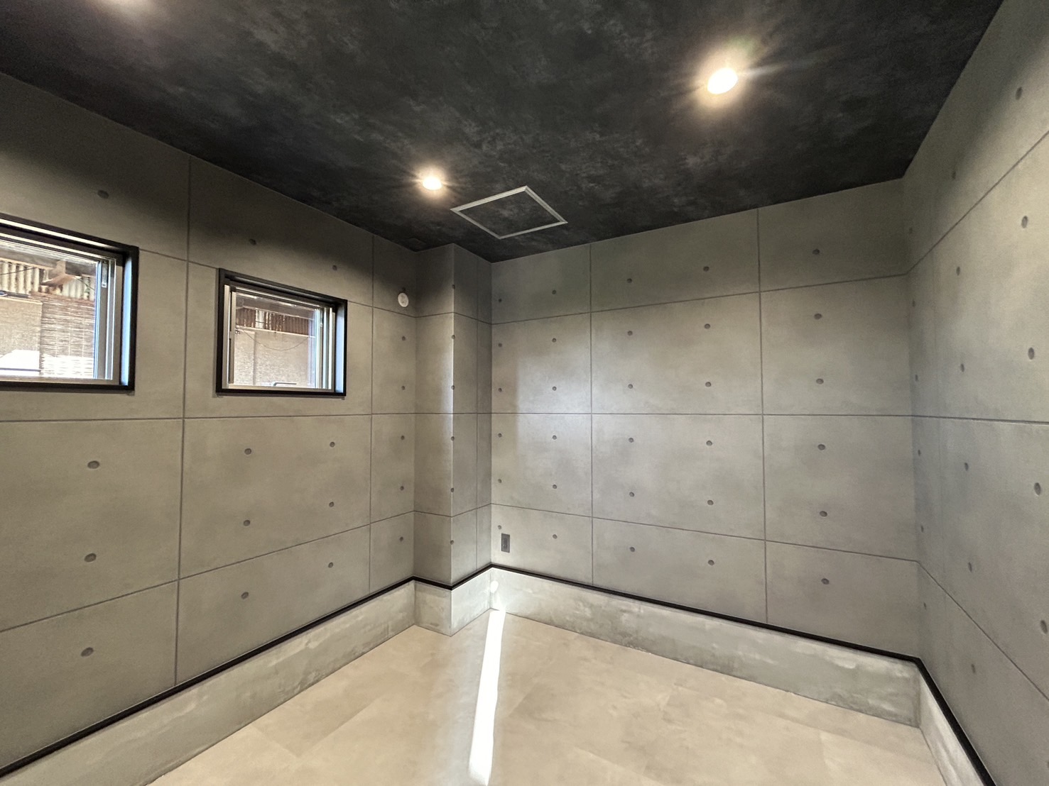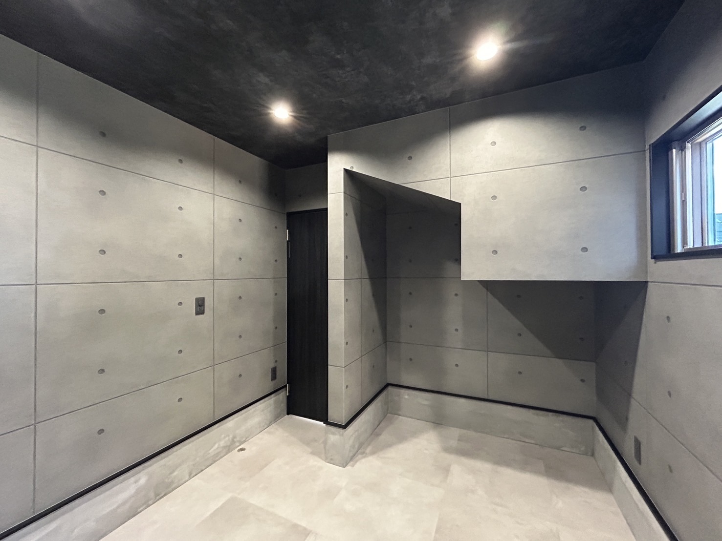 こちらのお部屋は、打ち放しコンクリート調のクロスを張りました👍無機質でひんやり冷たい印象となりお洒落ですね😊