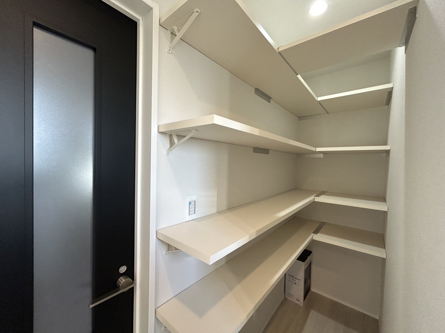 階段をあがったスペースに、収納量豊富なパントリーを設けました😊
