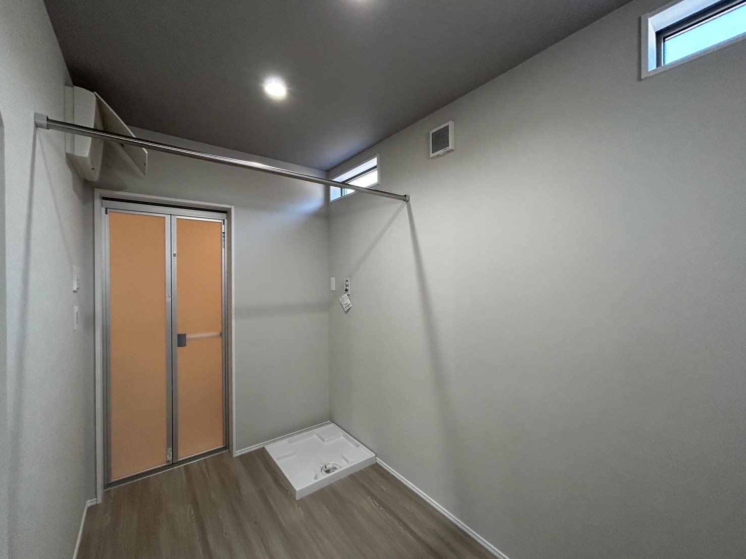 リビングから繋がる洗面脱衣所とお風呂スペース。物干しポールを設置し、家事動線がスムーズになる間取りとなっています👍