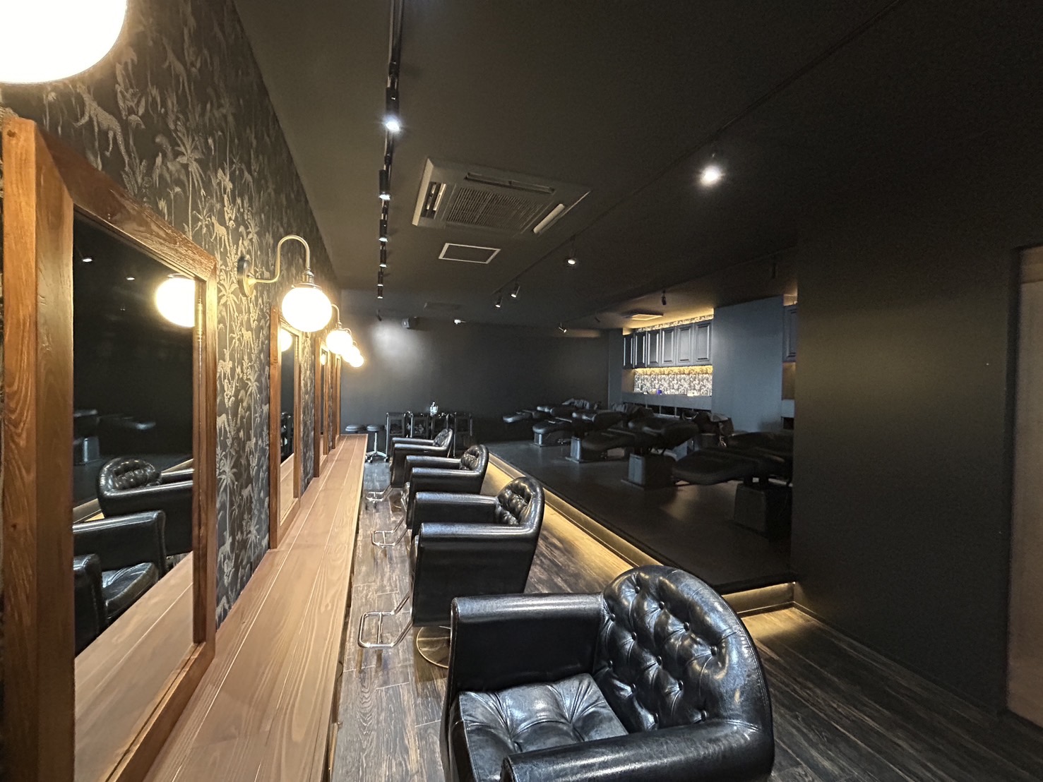 段差をつけた小上がりのシャンプーコーナーは、足元と収納棚に間接照明を設置しリラックスできる落ち着いた雰囲気に仕上げました✨
