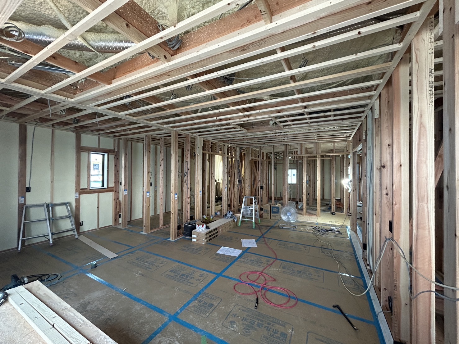 上棟後、天井と壁の『断熱』の作業が完了し、プラスターボードを張るための天井の下地作りが進んだ様子です😊
