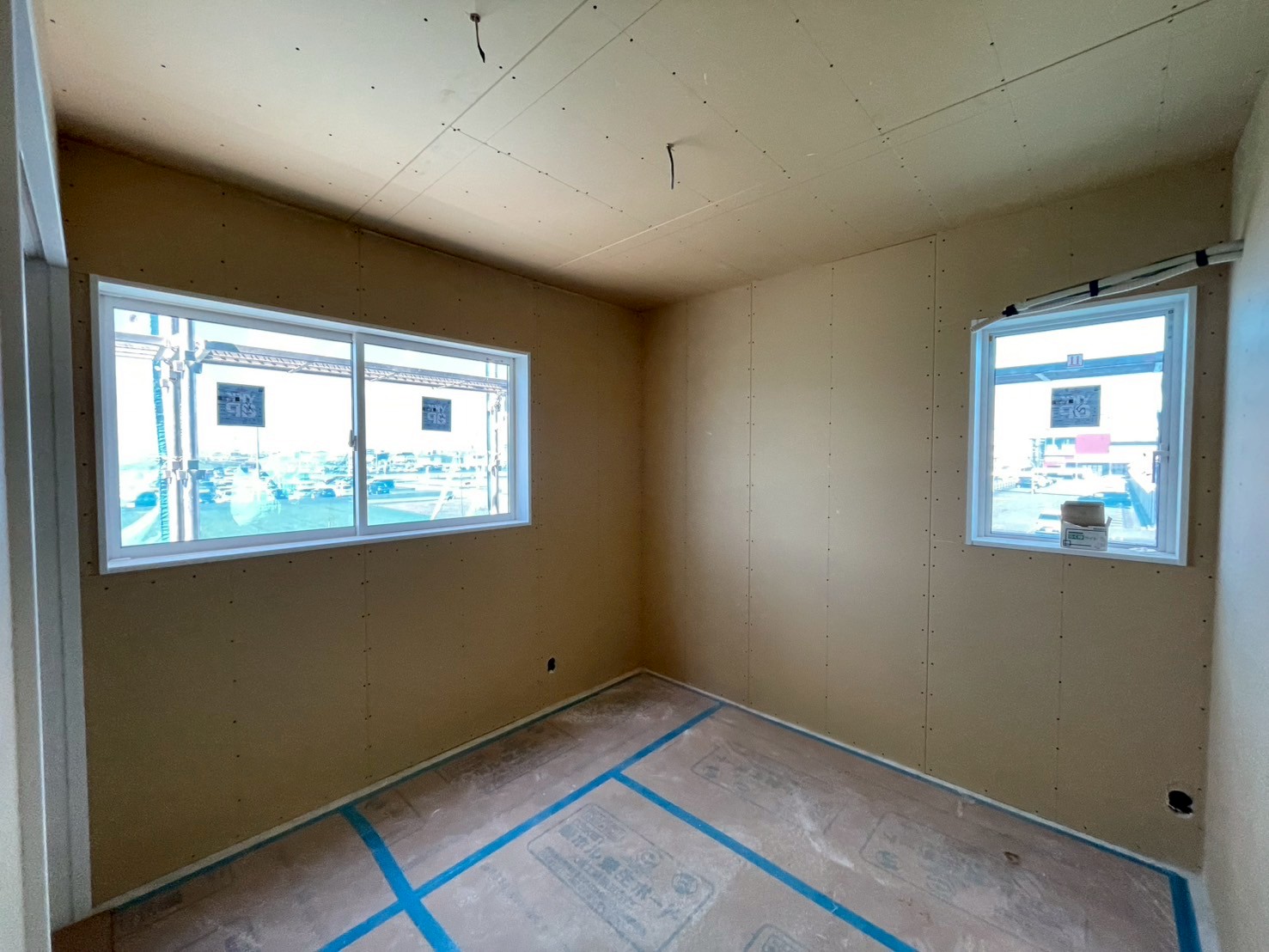 内部造作工事は、プラスターボードに配線のための穴を開ける作業が進んでいます👍