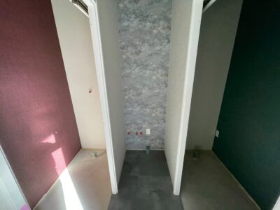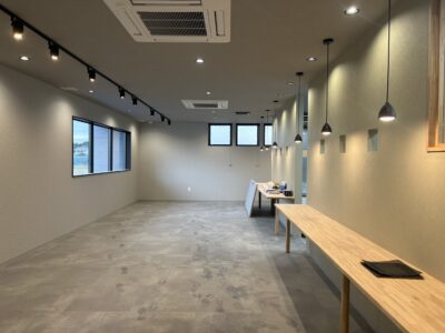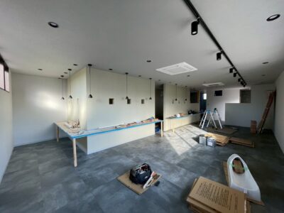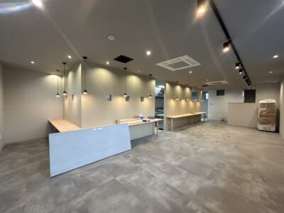 店舗内の壁と天井のクロス張りが完了し、照明と空調設備が設置されました👍