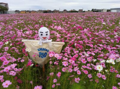 地元の小学生が作成した案山子(かかし)がコスモス畑中央にならび、ゆっくりと楽しめるように椅子も設置されていました😊