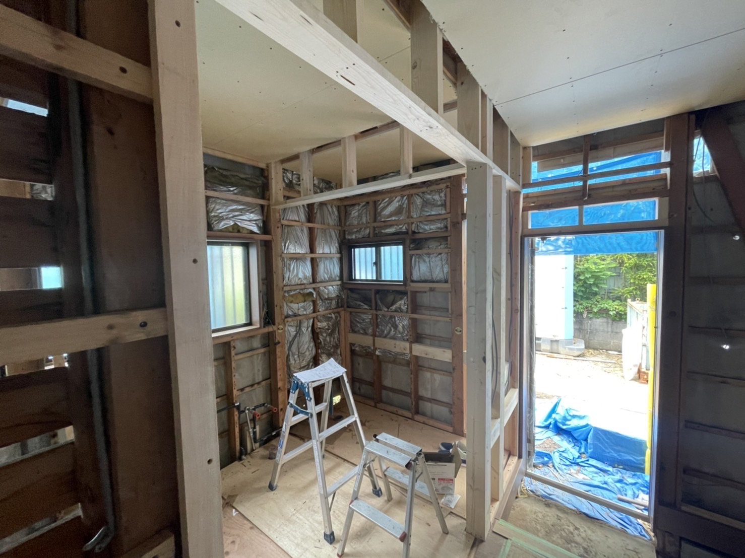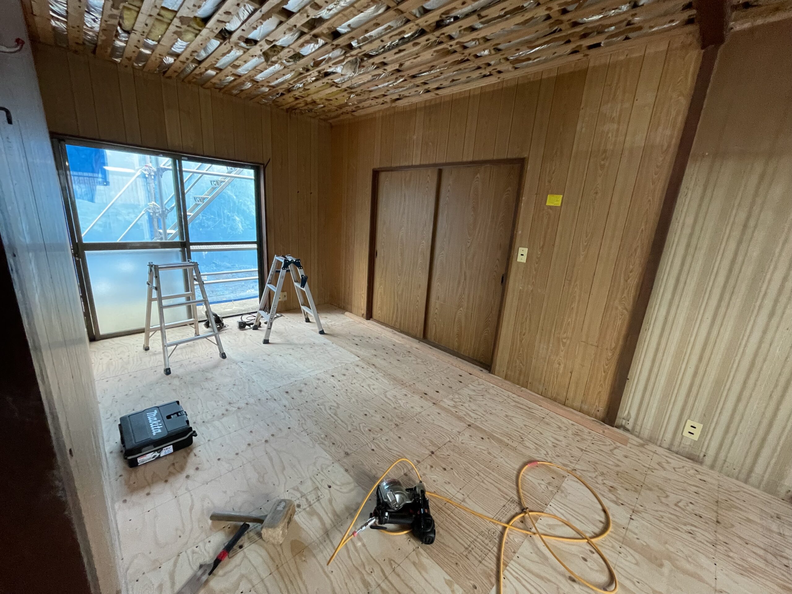 壁や天井に断熱材を入れ、床下には防湿シートを敷きました👍そして、新しい床を張っていきます🔨
