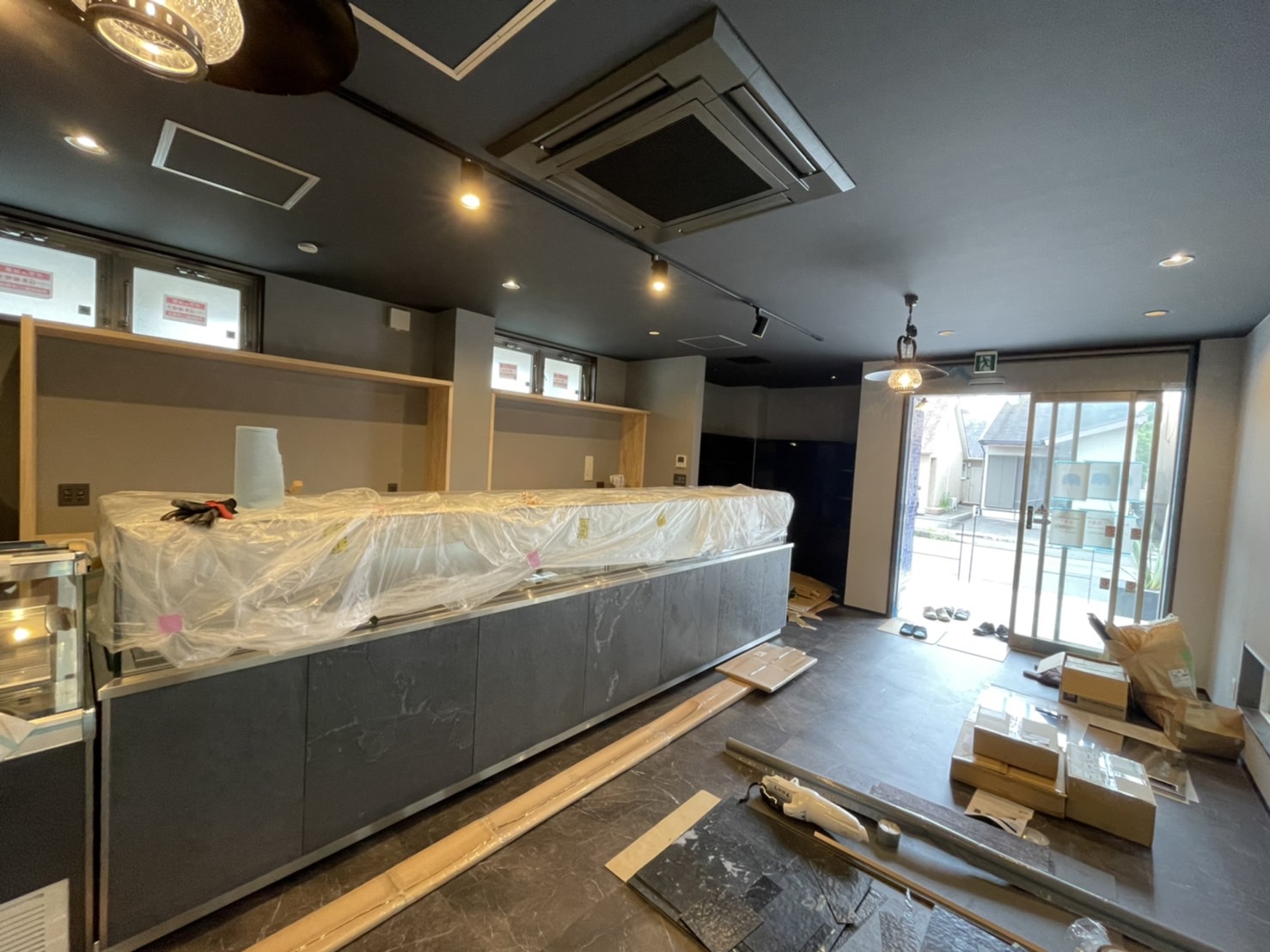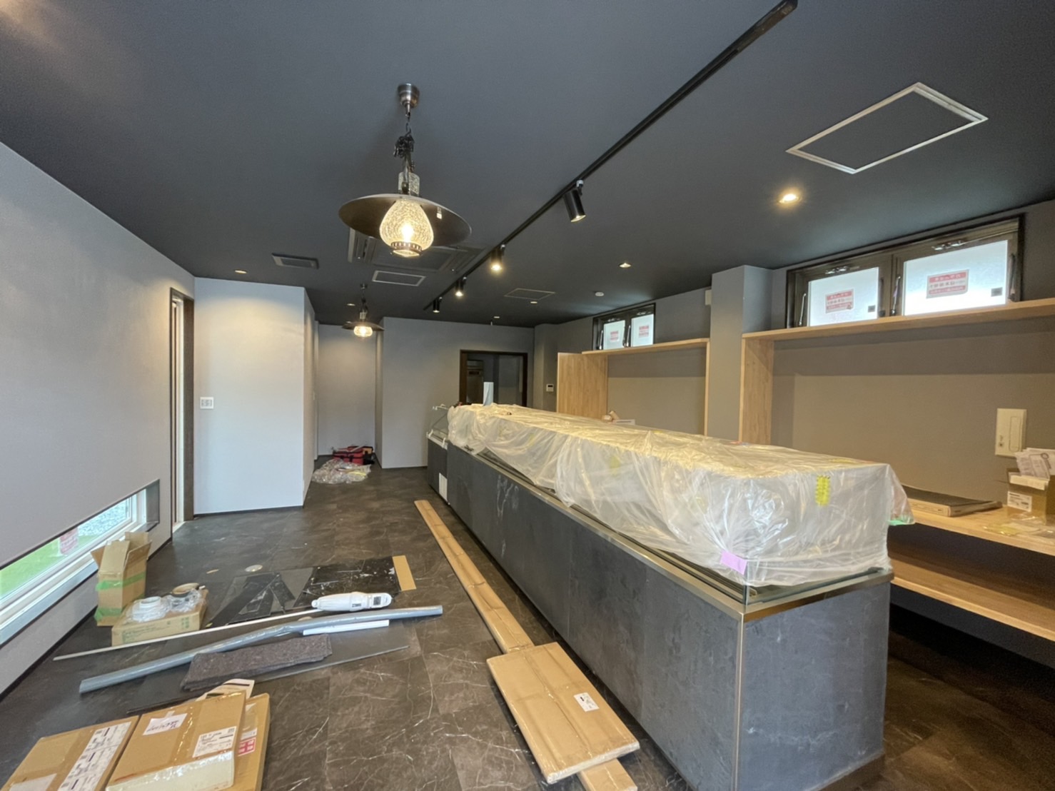 店舗内は照明とオーダーの家具を設置し、ショーケースは天然石のシートで装飾しました👍