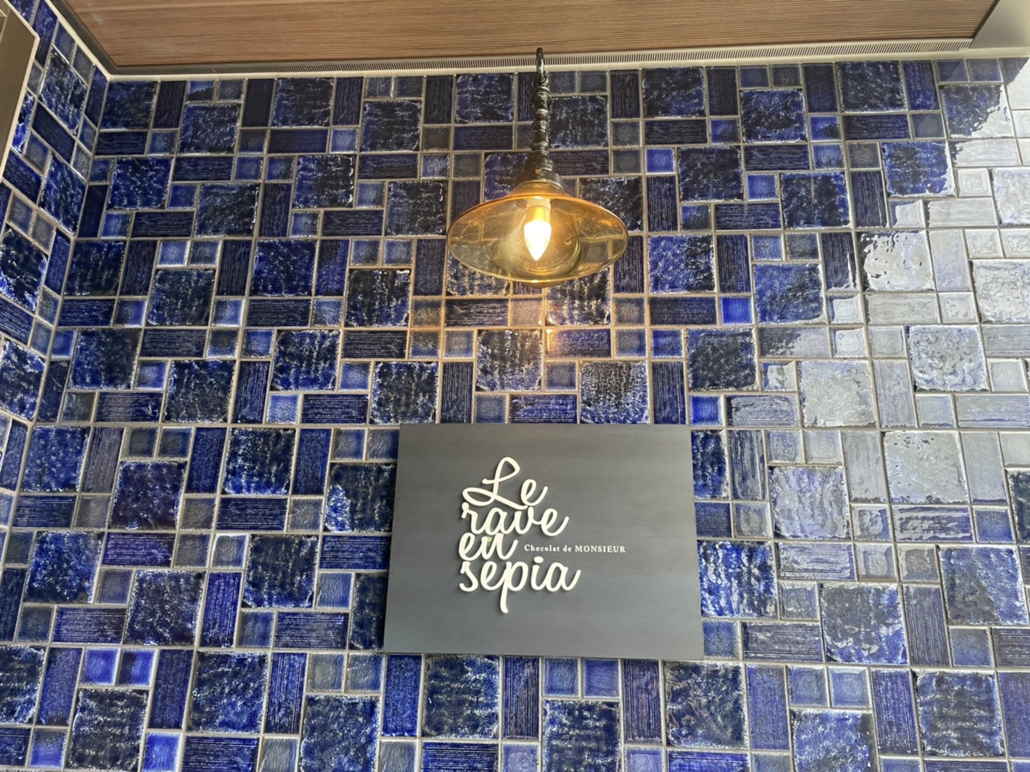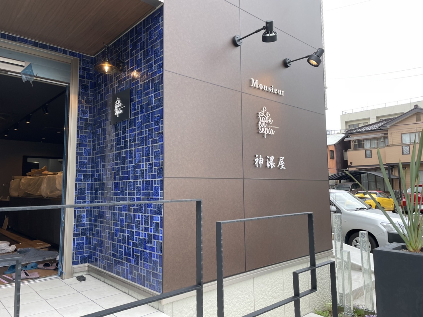 入り口のブルーを基調としたタイルの壁にも鉄の素地でできた「看板」を設置😊