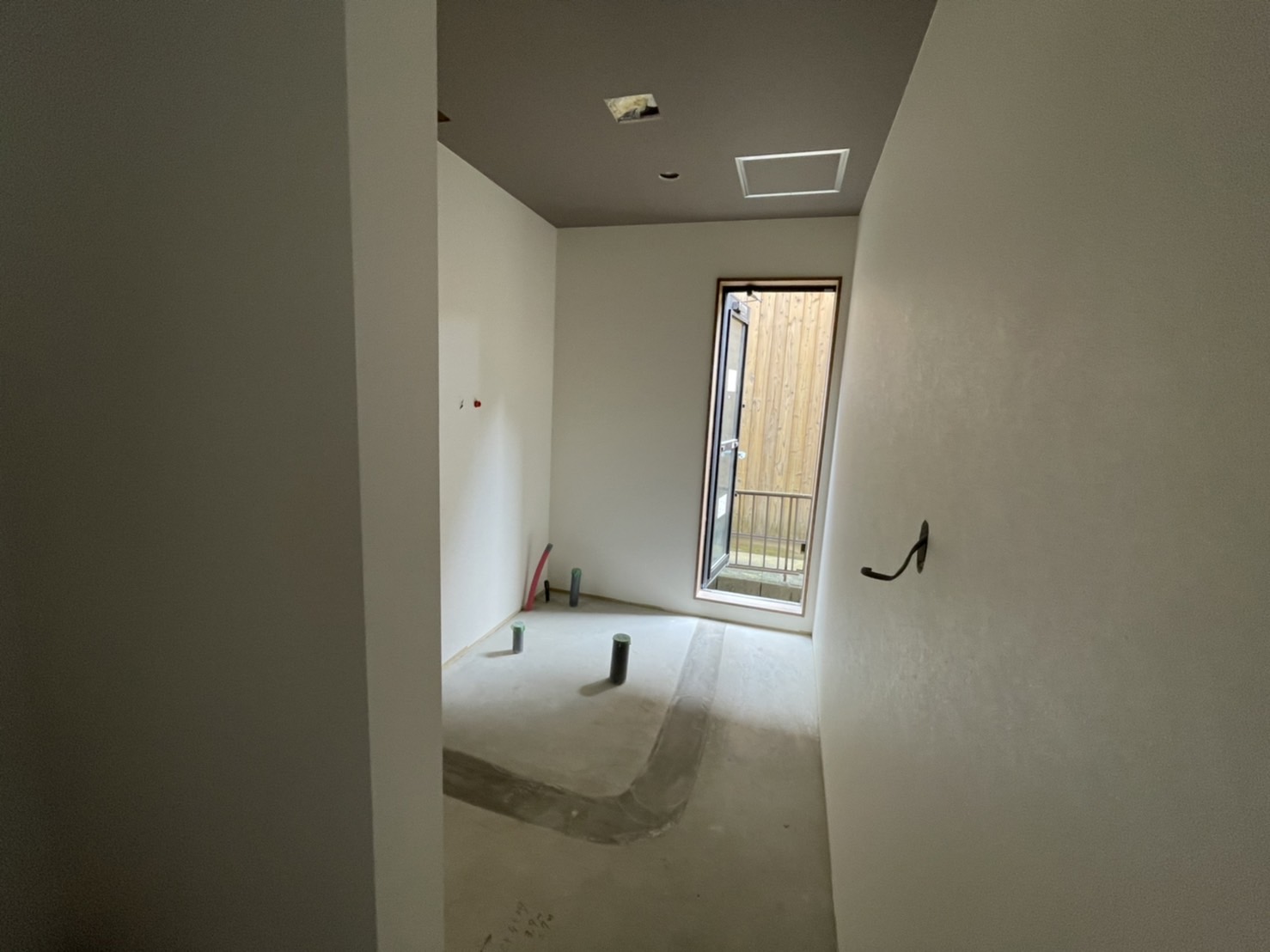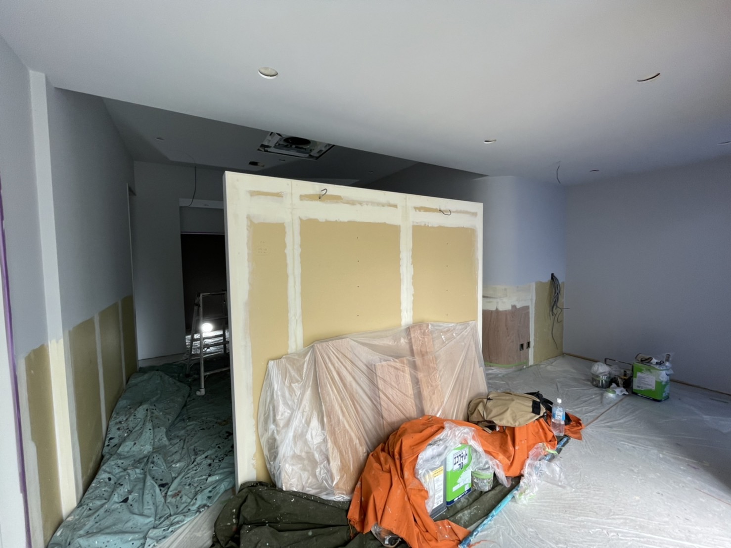 プラスターボードに白くパテが塗ってあるのは、継ぎ目やビスの段差を処理する作業となります😊