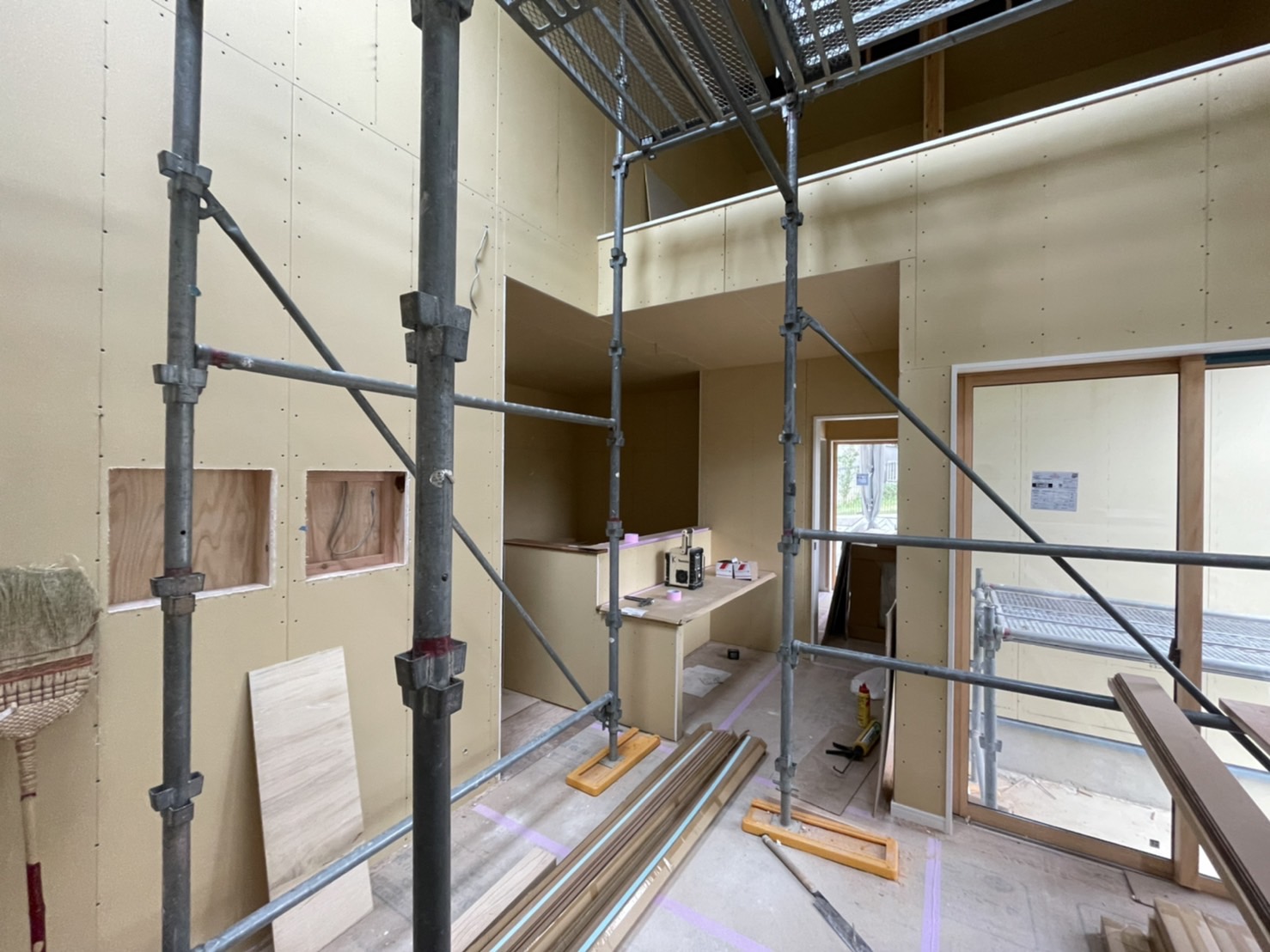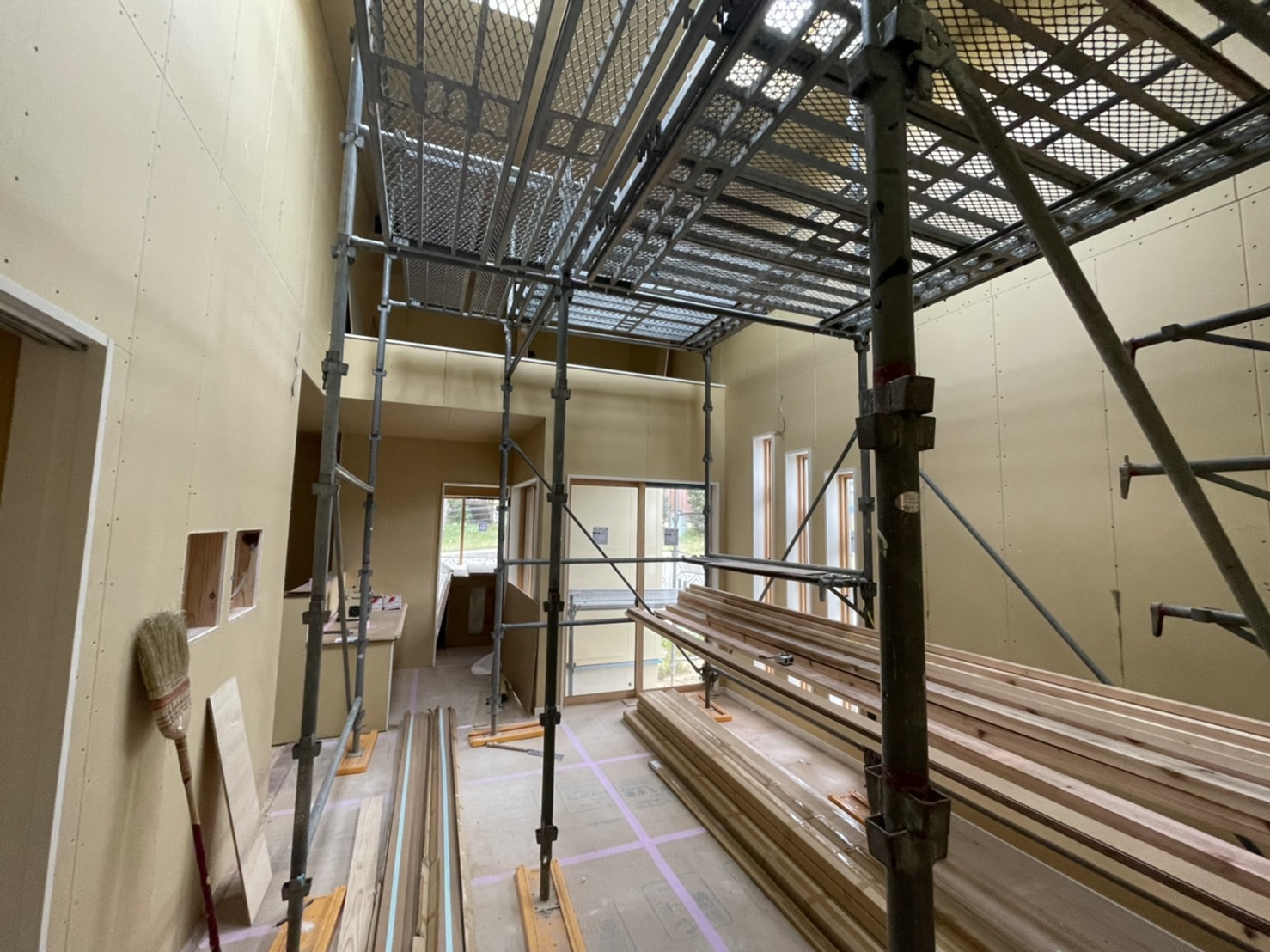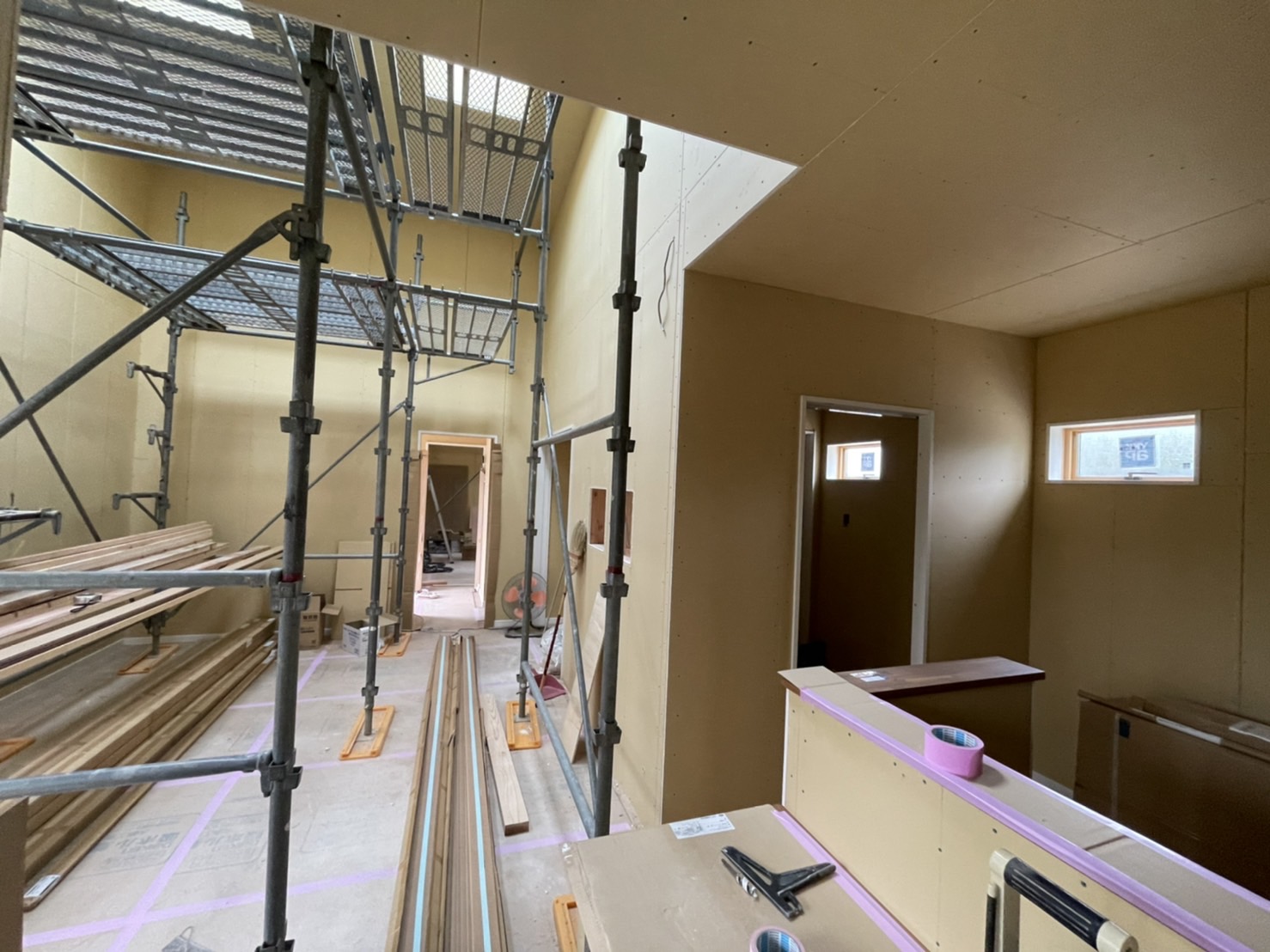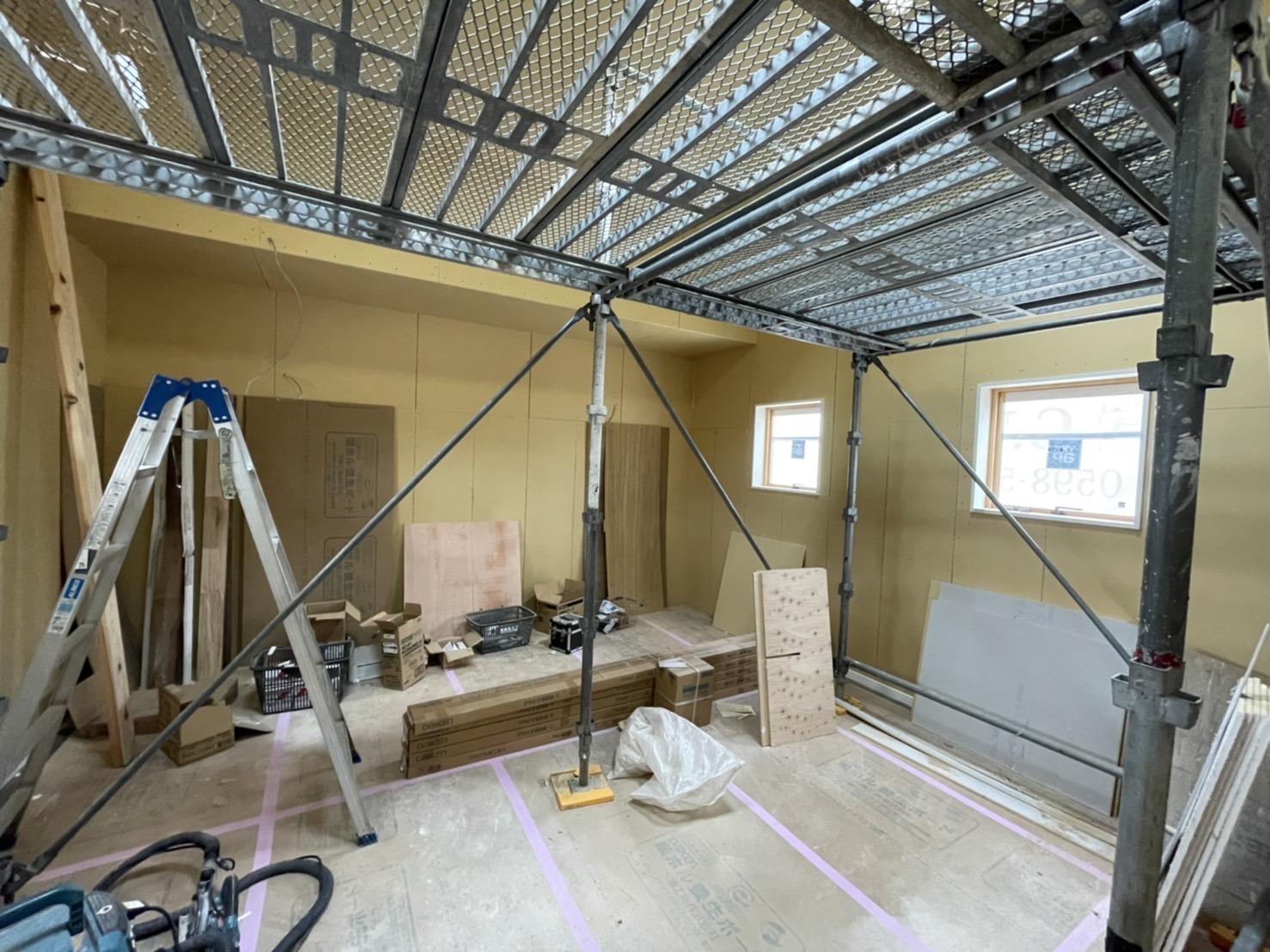 足場を組んでいるのは、明り取りの天窓とロフト、天井の高い場所の作業のためです😊