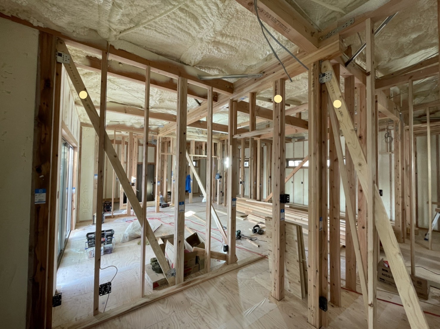 上棟後、作業は順調に進み、サッシの取付と吹付断熱が完了しました😊