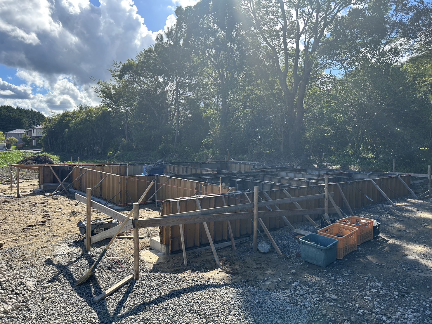 配筋検査合格後、ベース部分にコンクリートを流し、コンクリートが乾いてから、立ち上がり部分になる基礎内部の型枠を組みました👌