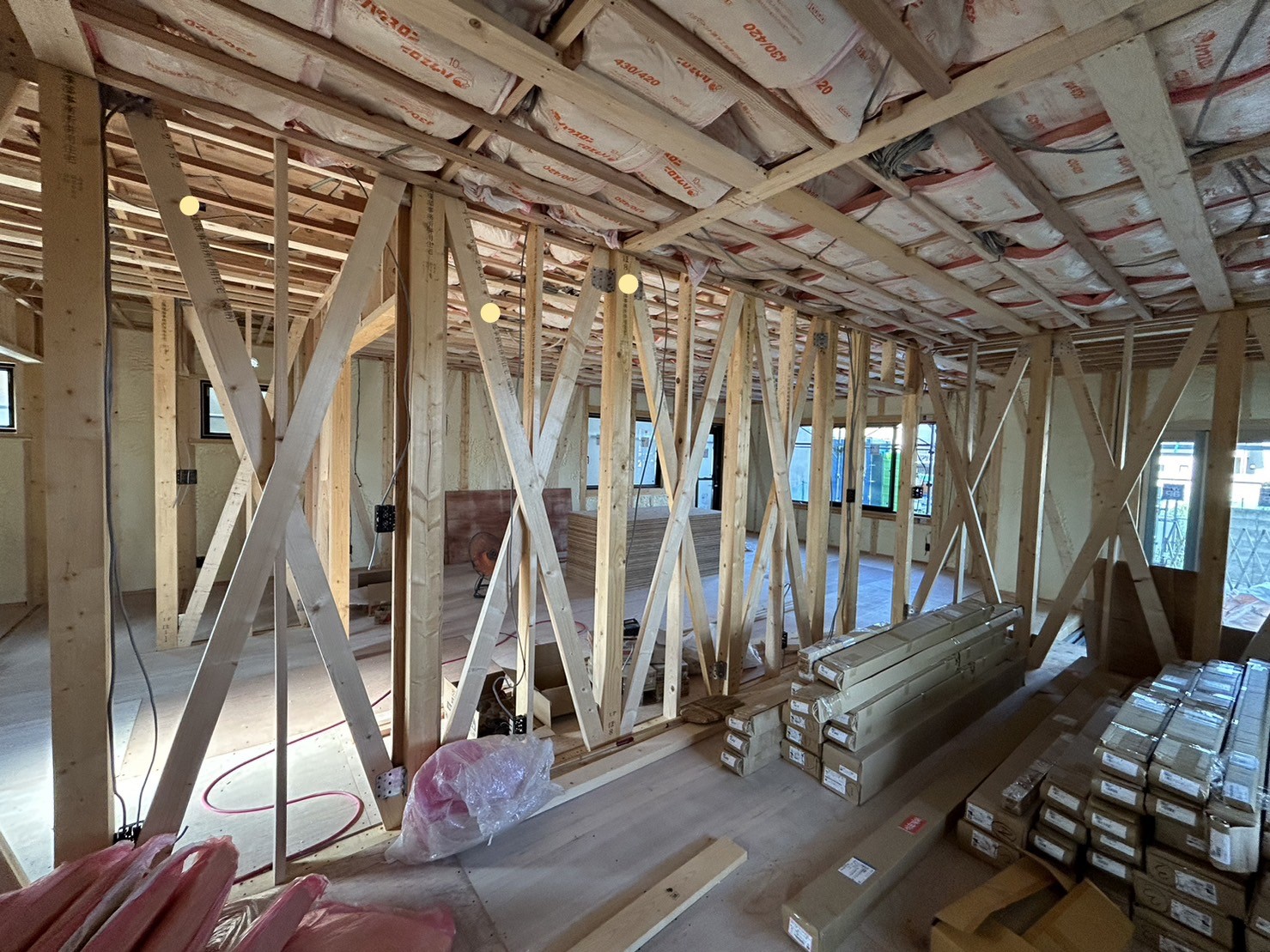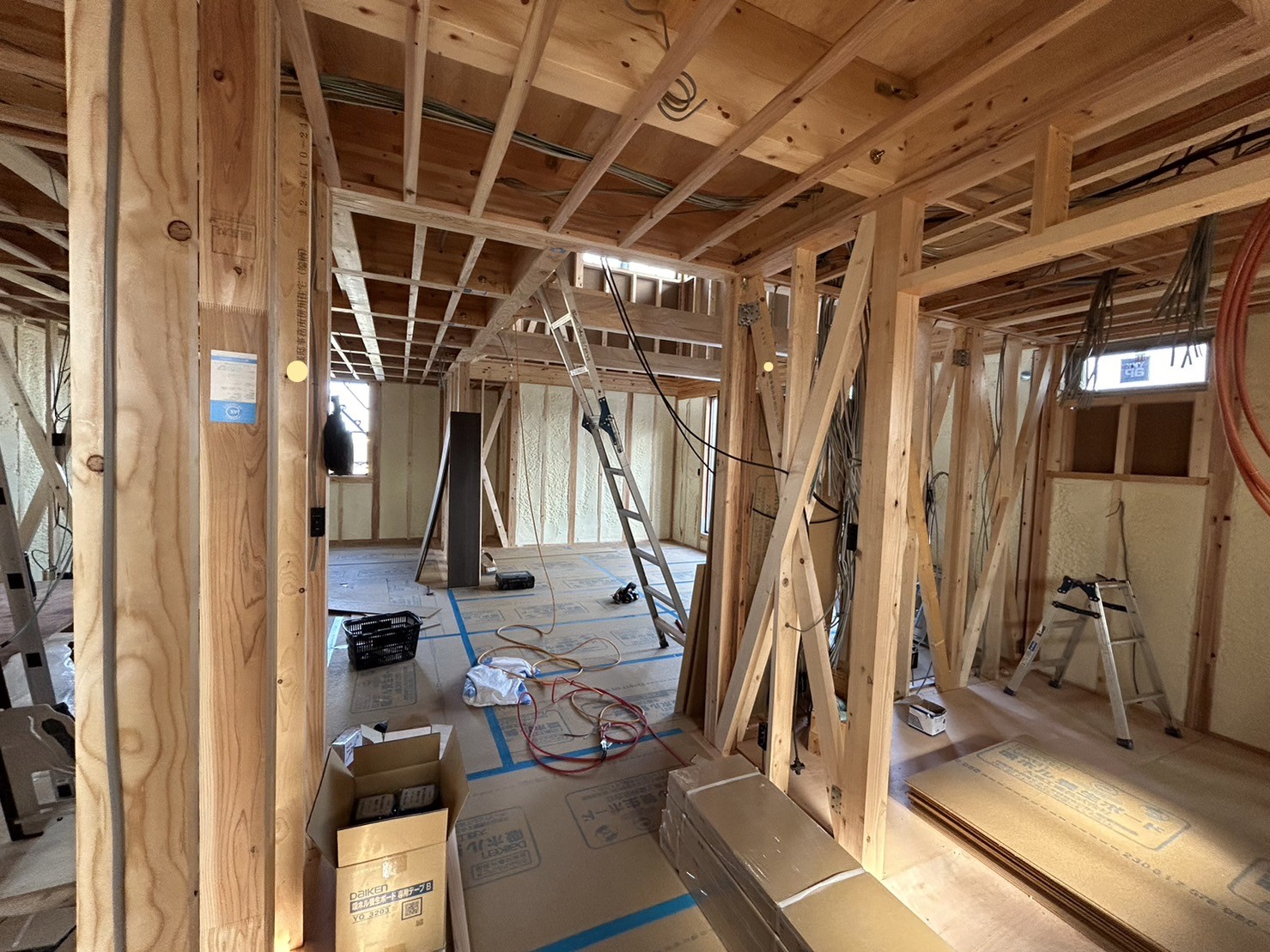 内部造作工事は、階ごとに断熱、床張りの工程が進んでいます。