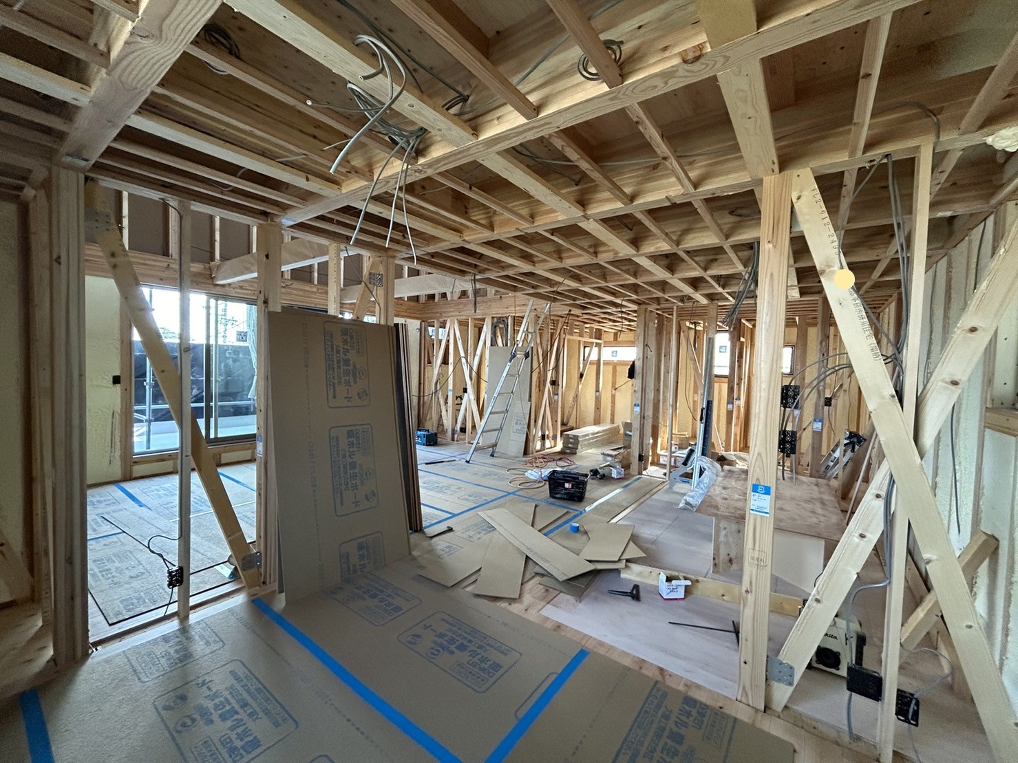 床張りが済んだ箇所は、お引越しまで床に傷がつかないように、クッション性のある養生ボードを敷いて大切に守らせていただきます👍