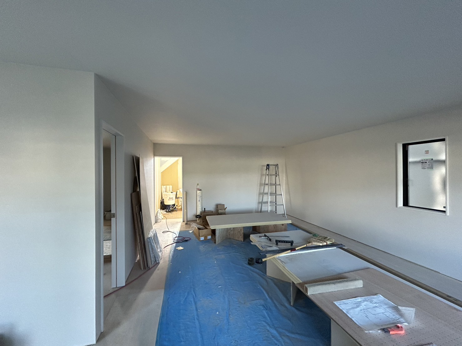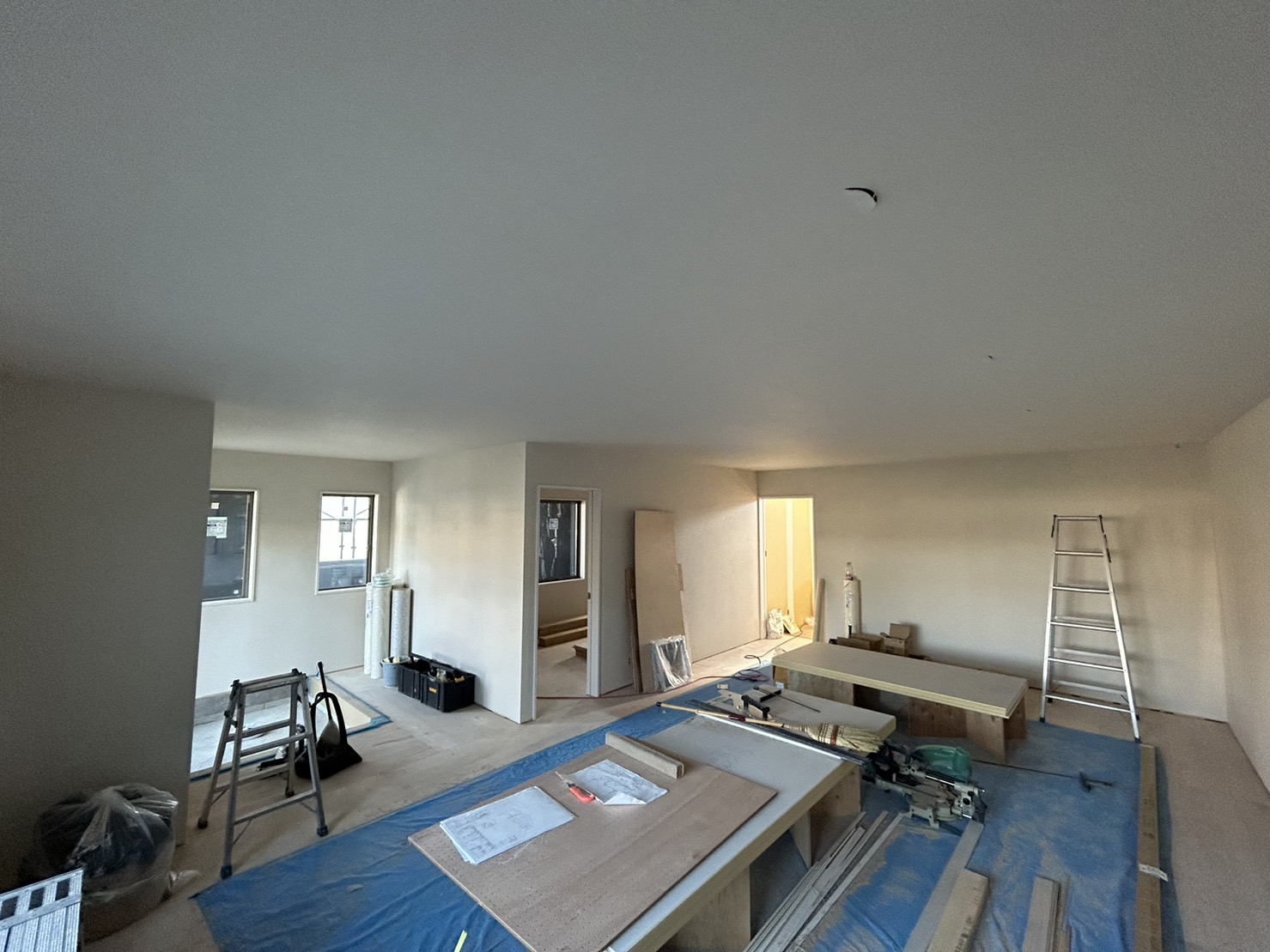 一階オフィスの壁と天井に真っ白なクロスが張られました👍