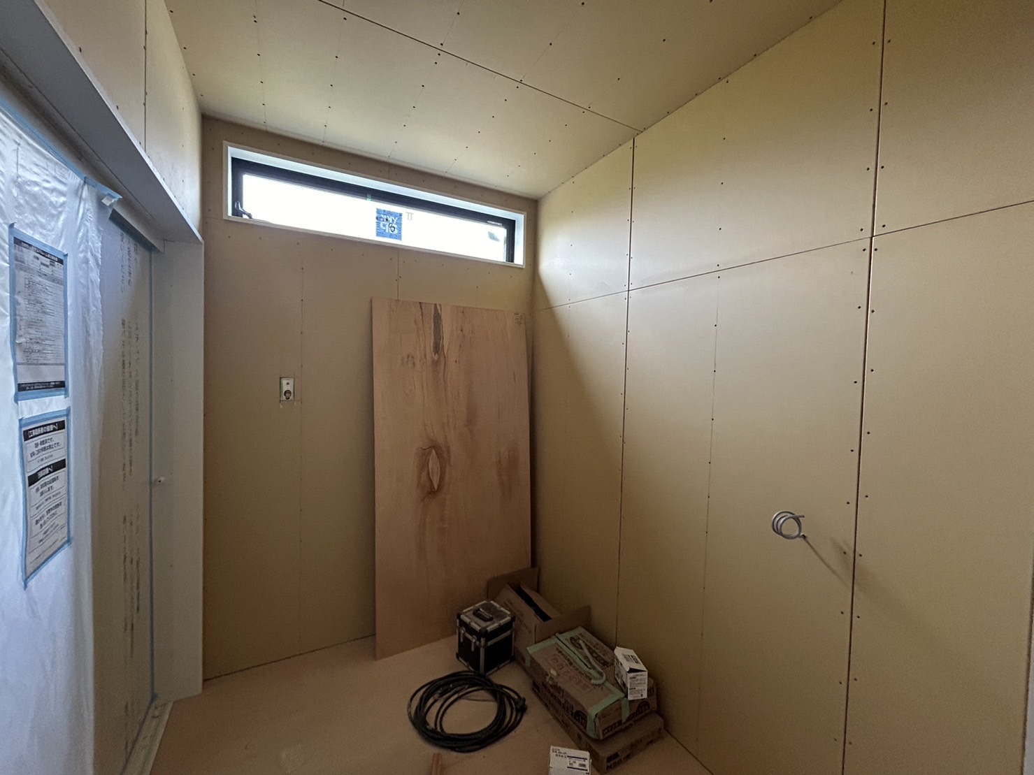 建物内部は引き続き、プラスターボードを張る作業が進んでいます😊天井から壁へと張られていきます🔨