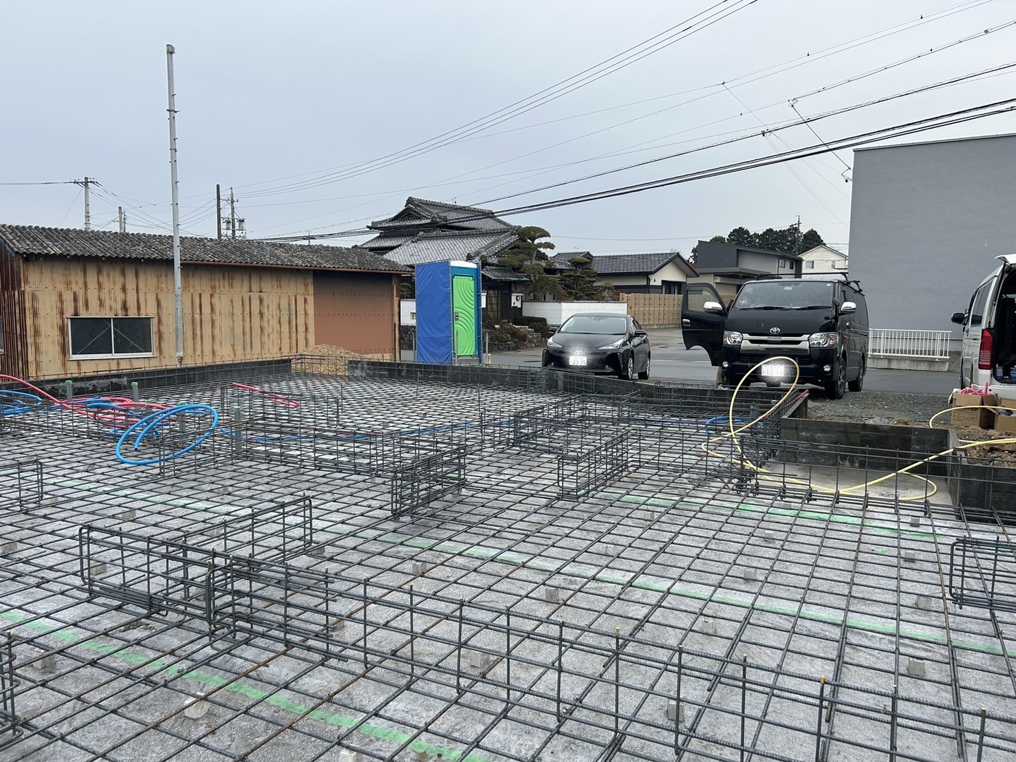 ② 砕石を入れ、防湿シートを敷き、捨てコンクリートを流したあと、鉄筋を組み(配筋)、外周の型を組みました🔧