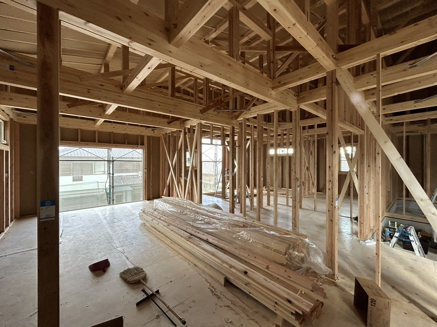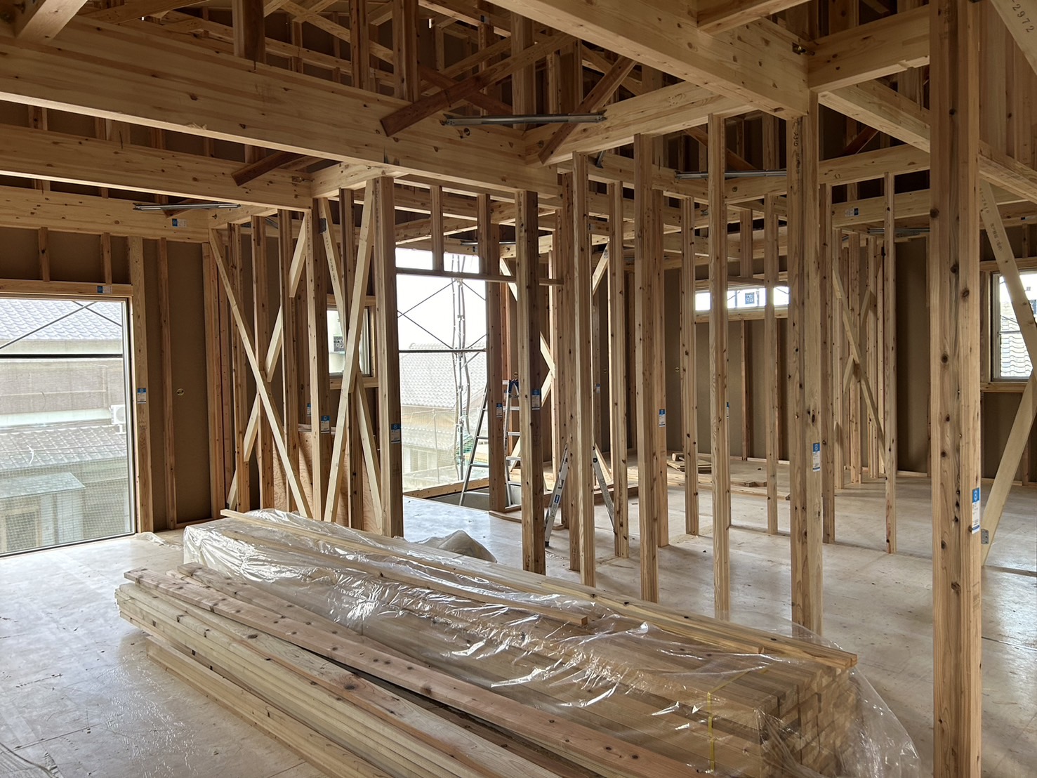 上棟後早速、建物内部の造作工事がはじまり、筋交いや構造上の金物がはいりました👍