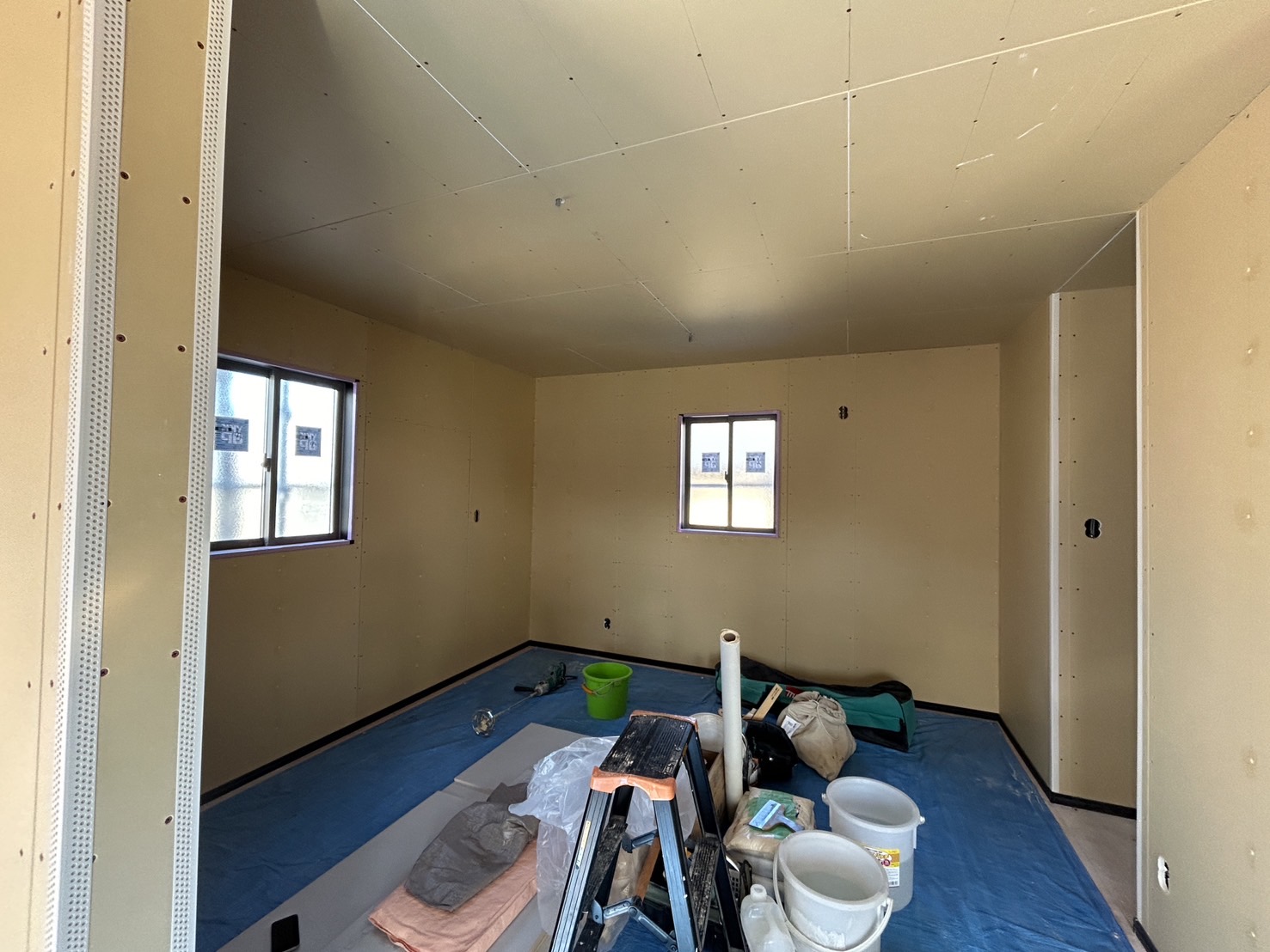 クロスを綺麗に張るためのプラスターボードの継ぎ目やビスの段差処理後、天井から壁へクロス張りが進んでいます😊