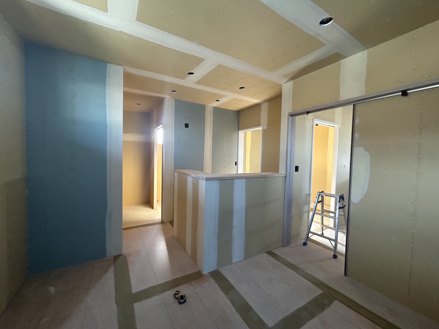 白く塗ってある部分は、クロスを綺麗に張るためにプラスターボードの継ぎ目やビスの段差処理をしてあります👍