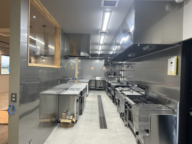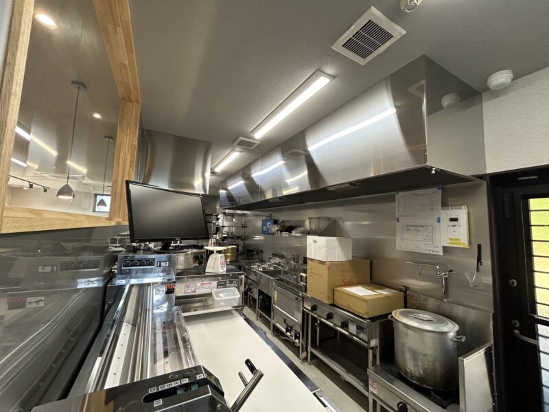 厨房は業務用機器を効率的に配置したステンレス仕様で、清潔感と機能性を両立。