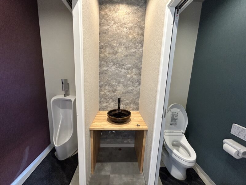 トイレは左右対称の男女別設計とし、洗面台には木と石調素材を組み合わせ、店舗全体の統一感を持たせています。