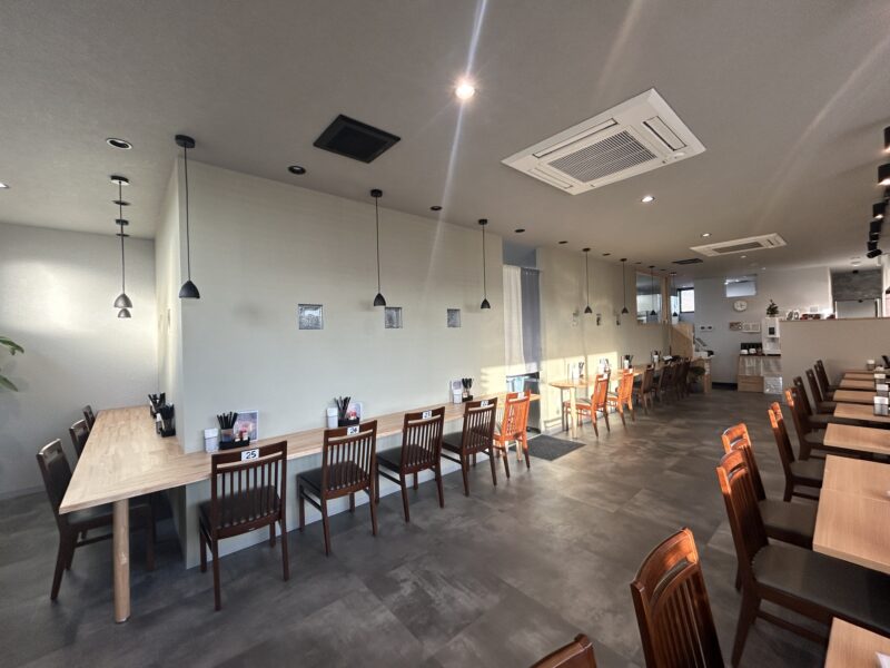 店内は明るく開放的な空間構成で、カウンター席とテーブル席をゆったりと配置。